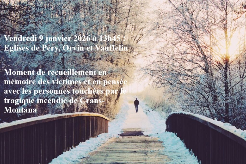 La Paroisse réformée de Rondchâtel et les Municipalités d’Orvin, Sauge, Romont et Péry-La Heutte s’associent à la douleur des familles et des proches des victimes de la tragédie de Crans-Montana. Pour ce faire, elles invitent la population, quelles que soient les convictions ou croyances, en toute liberté, à partager un moment de prière et de recueillement :
